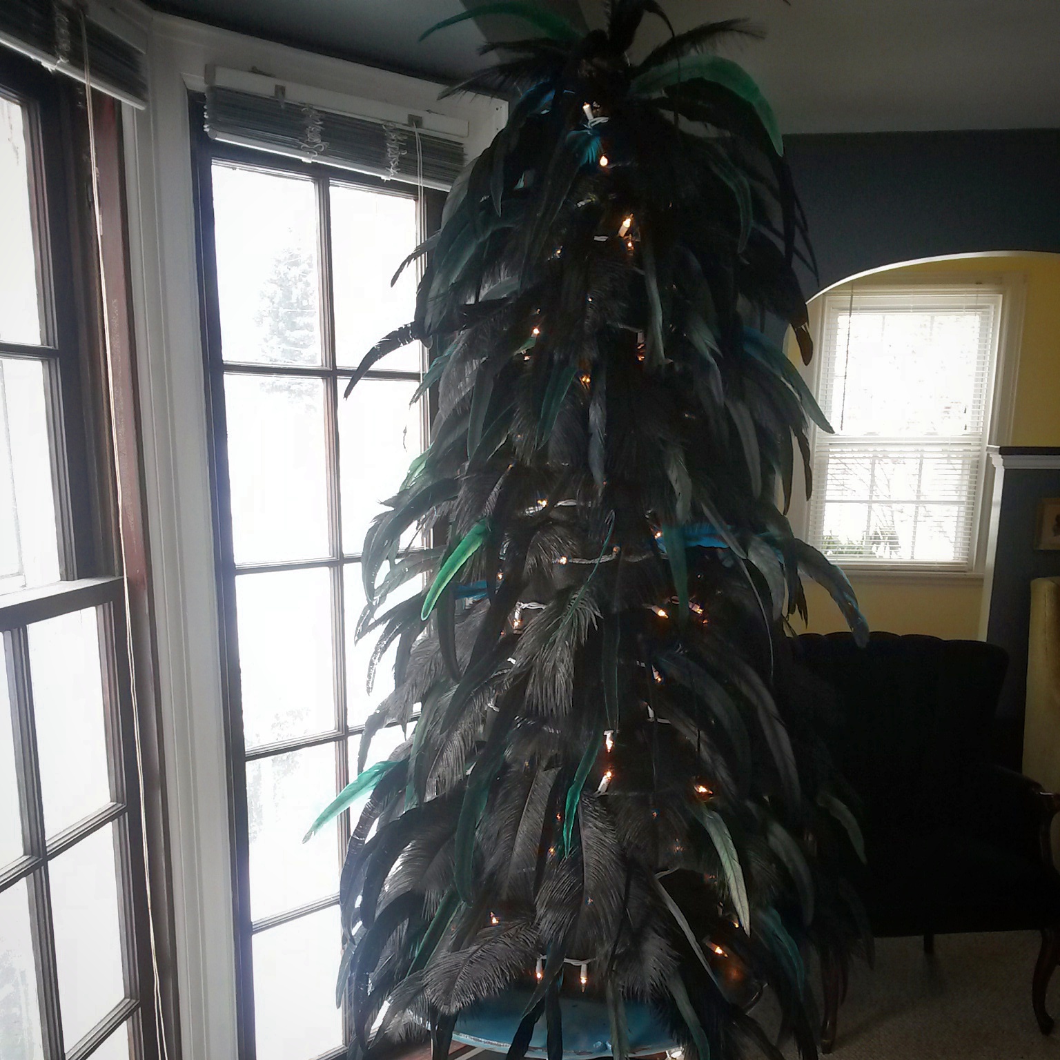 Another round of feathers in! These are iridescent black & dark green. Now for the bright showstopper feathers that will be the “ornaments”.